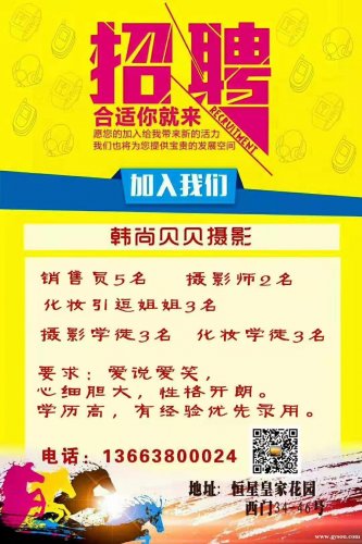 河南省巩义市韩尚贝贝儿童摄影东区恒星皇家花园西门店诚聘:1.市场销售人员4名 2.前台门市接待5名,男女不限,上班时间早8点半到晚6点 3.化妆师2名,引逗姐姐2名 4.儿童摄影师2名,摄影助理2名。 5.后期设计师2名 一经录用待遇优厚,2000-6000成为骨干可拿分红股。 6.有意者打电话咨询13663800024,微信同号,详细事宜私聊!