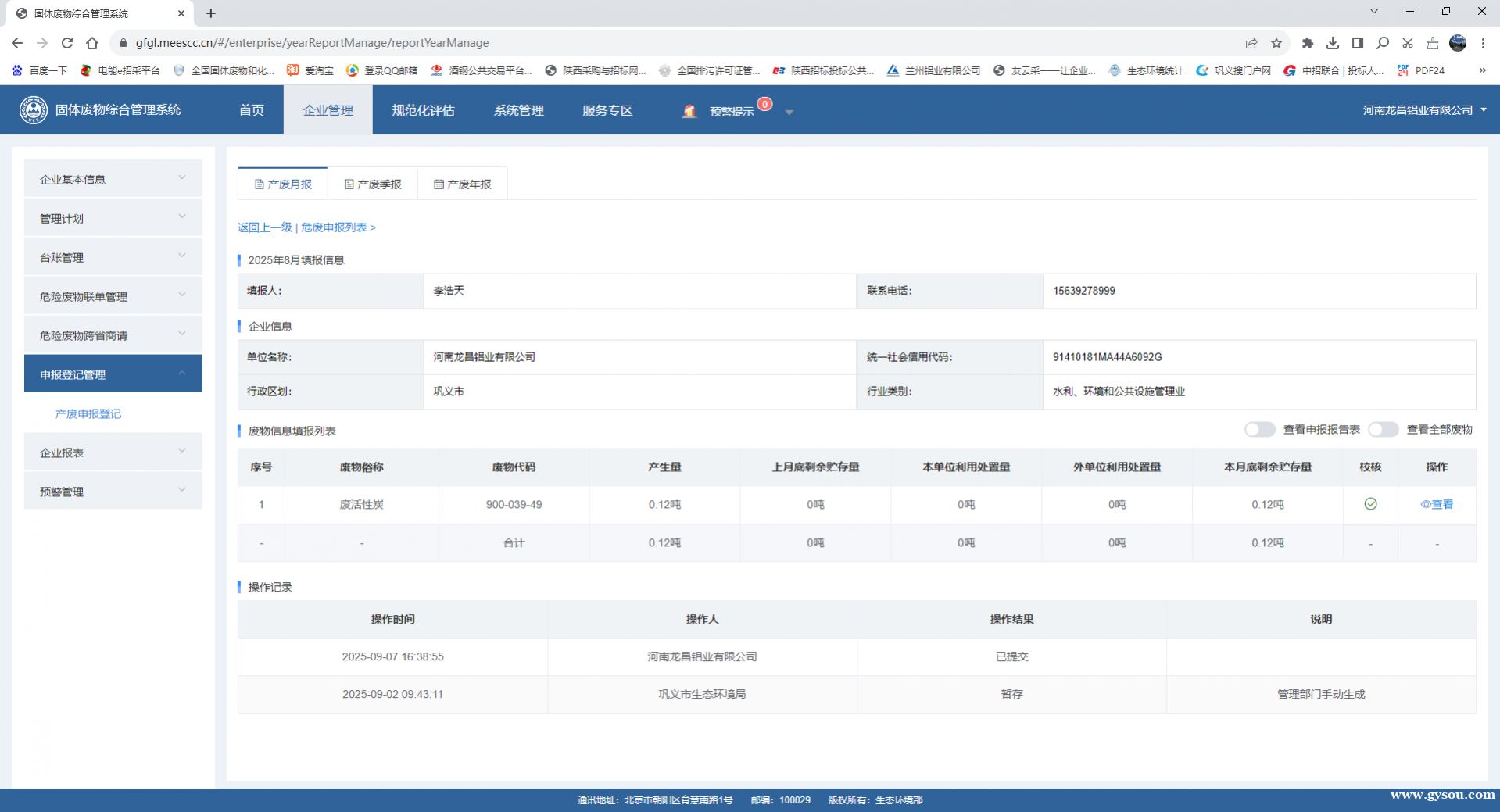 河南龙昌铝业有限公司于2025年8月进行活性炭更换,产生环节:在利用设施2中即为浮选机机组运行中有组织废气产生的异味排放至环保设施运行系统中,即为UV光氧催化+活性炭吸附环节。